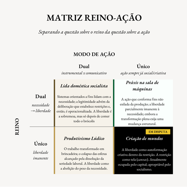 O que importa para as apostas polêmicas é o que esta grade revela. Benanav planta o socialismo firmemente no quadrante superior esquerdo (“Lida Doméstica Socialista”): o assentamento de dois reinos e a ação dual. Sistemas orientados a fins aqui, normatividade ali. Necessidade e liberdade em salas separadas, comunicando-se por memorando. É uma posição defensável – Habermas a defendeu –, mas, mesmo assim, é uma posição, não uma descrição neutra de como as coisas devem ser.