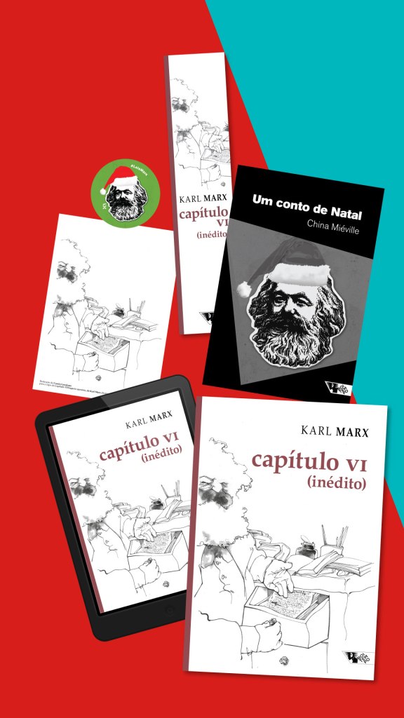 A caixa do mês ainda traz um cartaz A5 com a capa do livro, um adesivo de Marx em versão natalina, um marca-página e o livreto “Um conto de Natal”, de China Miéville.