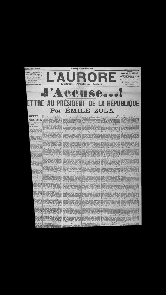 Mas o impacto maior sobre a opinião pública viria apenas em janeiro de 1898 quando Émile Zola publica “J’accuse!” [Eu acuso!], uma carta aberta ao presidente da República, no jornal L’Aurore, de Georges Clemenceau. Foram feitas 200 mil cópias do artigo, denunciando a armação maliciosa contra Dreyfus (e levando Zola ao exílio).